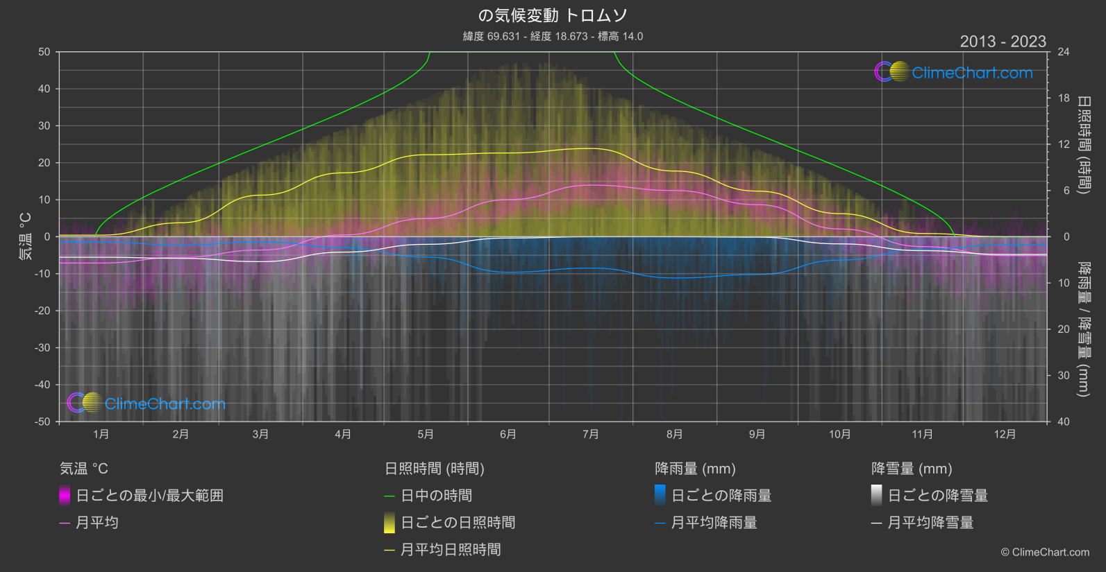 トロムソ, ノルウェーの包括的な気候変動チャート: 月ごとの平均値と影響の傾向