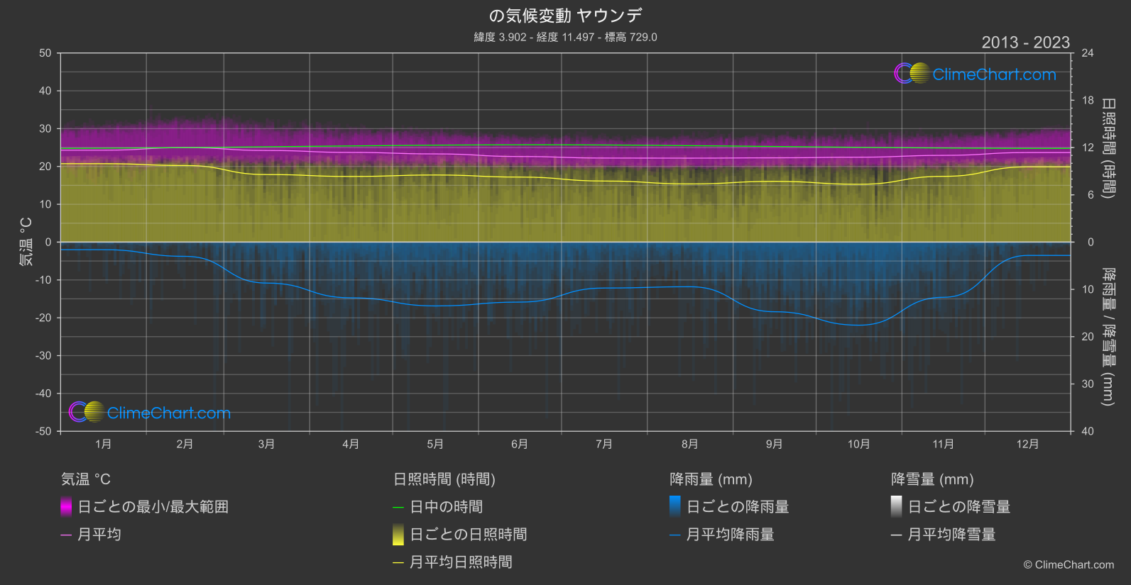 ヤウンデ, カメルーンの包括的な気候変動チャート: 月ごとの平均値と影響の傾向