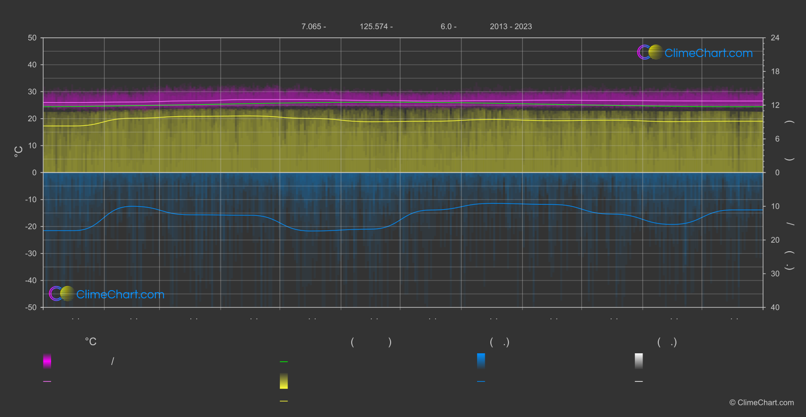 แผนภูมิภูมิอากาศที่ครอบคลุมของเมืองดาเวา ฟิลิปปินส์: ค่าเฉลี่ยรายเดือนและแนวโน้มสภาพอากาศ