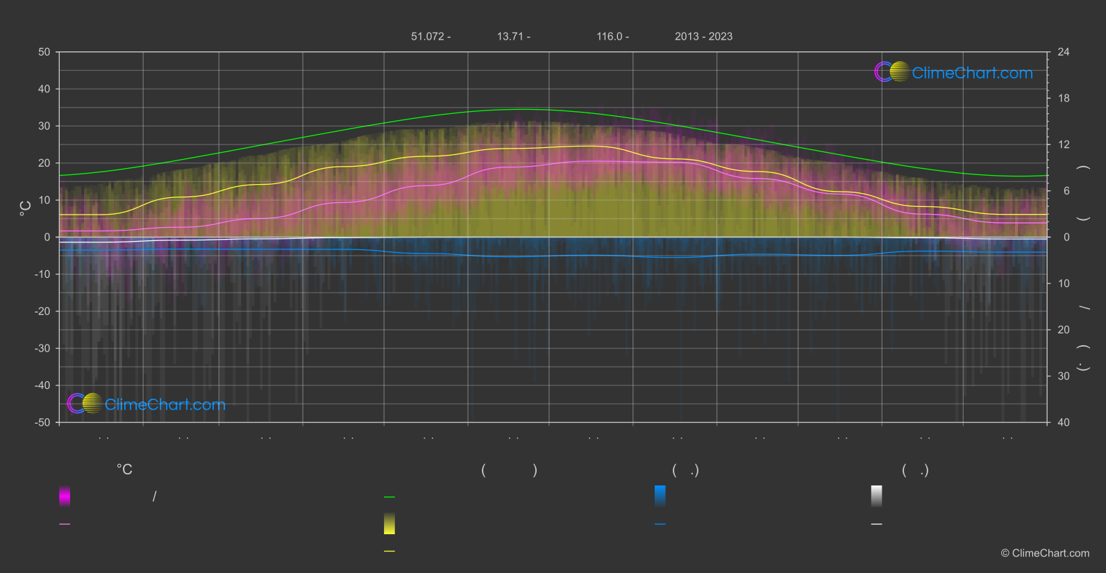 แผนภูมิภูมิอากาศที่ครอบคลุมของเดรสเดน เยอรมนี: ค่าเฉลี่ยรายเดือนและแนวโน้มสภาพอากาศ