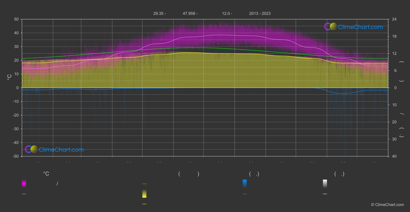 แผนภูมิภูมิอากาศที่ครอบคลุมของคูเวตซิตี คูเวต: ค่าเฉลี่ยรายเดือนและแนวโน้มสภาพอากาศ