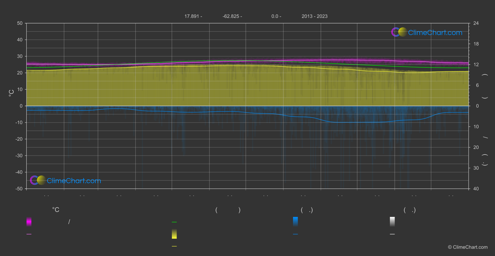 แผนภูมิภูมิอากาศที่ครอบคลุมของกุสตาเวีย เซนต์บาร์เธเลมี: ค่าเฉลี่ยรายเดือนและแนวโน้มสภาพอากาศ